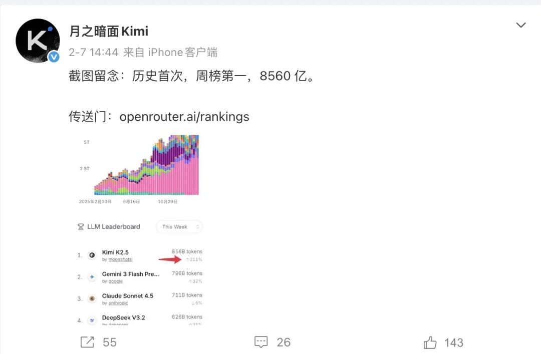 而这个变化的起点,是今年 1 月 27 日 Kimi K2.5 版本的上线。