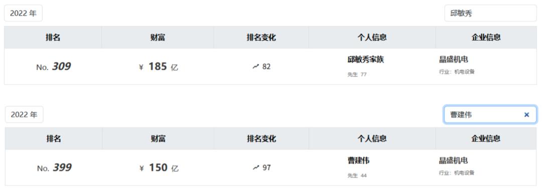 公司市值飙升也带动创始人身家暴涨。据胡润百富榜披露,2022年邱敏秀家族与曹建伟的财富分别达到185亿元和150亿元。