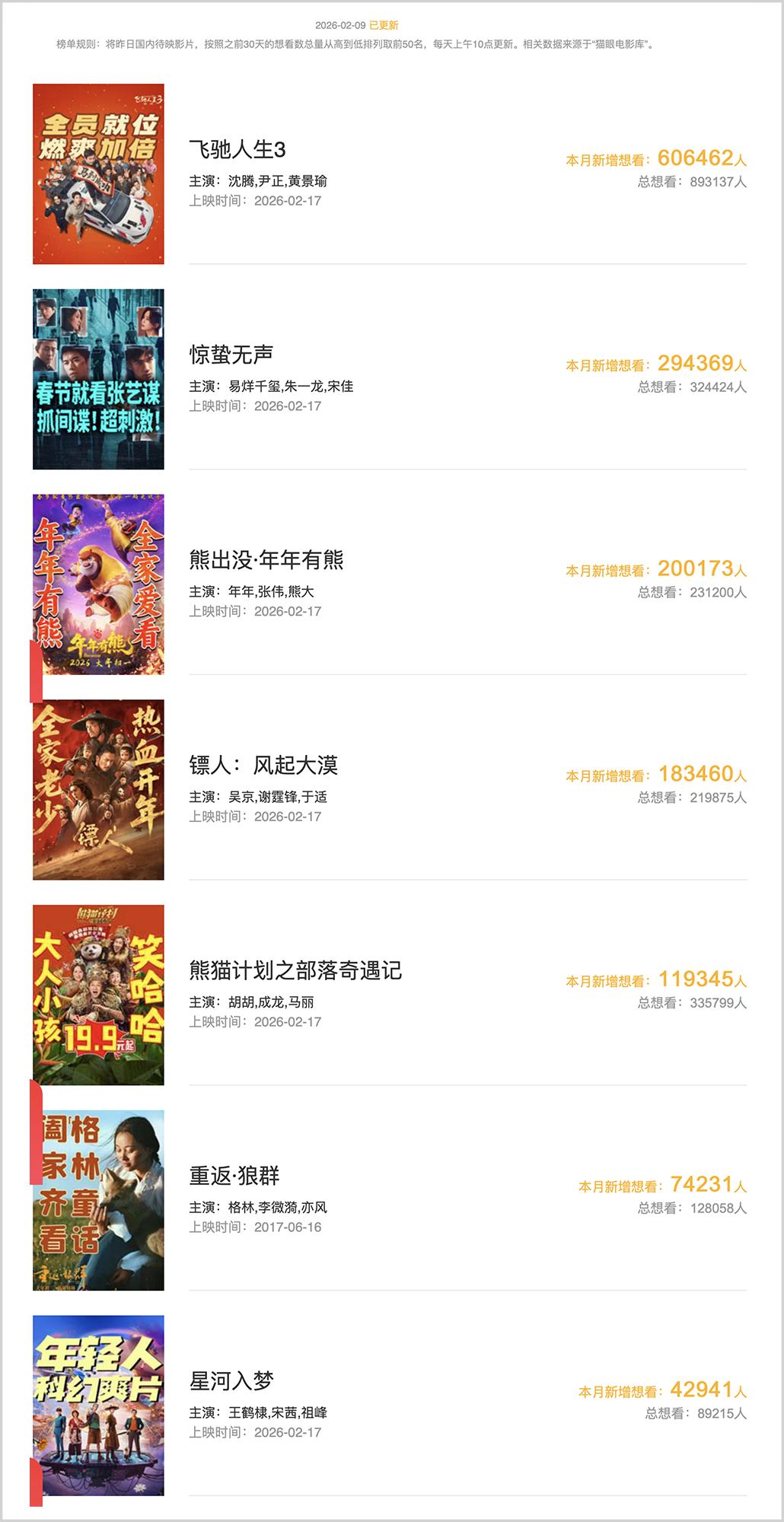根据猫眼电影想看榜(截至2月9日),《飞驰人生3》《惊蛰无声》《熊出没》分列前三,其中《飞驰人生3》总想看人数达到了89万,本月新增就超过60万人,断崖式领先。