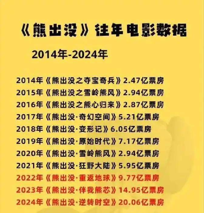 相比高投入的大制作电影,熊出没投资成本低廉,2014年的成本仅1000多万元,却创造了2.47亿元的票房成绩,2024年的《熊出没·逆转时空》票房超过20亿元,2025年的《熊出没之重启未来》被《哪吒2》分流,票房滑落到近8亿元。不过,今年仅有其一部动画电影,票房也极有可能触底反弹。
