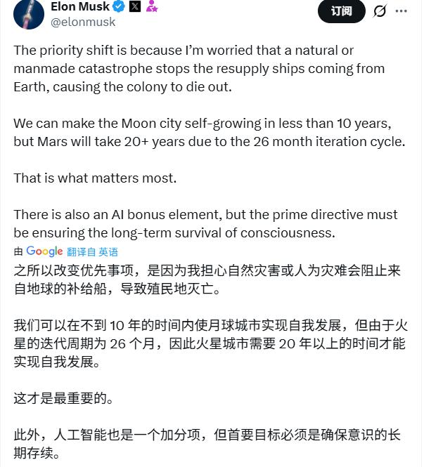 随后他继续发帖,进一步道出这一战略转向背后的深层忧虑:“之所以改变优先事项,是因为我担心自然灾害或人为灾难可能切断来自地球的补给,从而导致殖民地走向灭亡”。