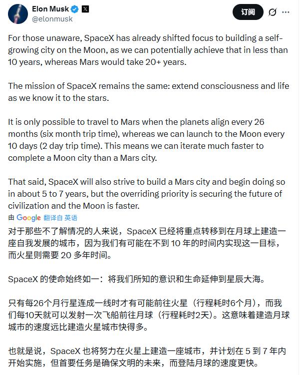 马斯克在社交媒体发帖解释道:“对于不了解最新进展的人来说,SpaceX的重点已经转向月球,并计划在那里建设一座可自我发展的城市。我们有可能在不到10年内实现这一目标,而真正实现火星殖民,则仍需要更多的时间”。
