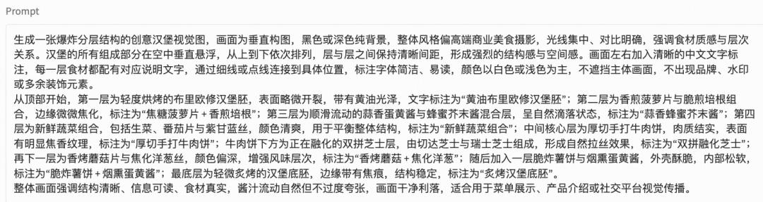 这次我输入了一段长达600多字的提示词,逐层描述汉堡的十种食材及其上下位置,对AI的结构理解与还原能力提出了很高要求: