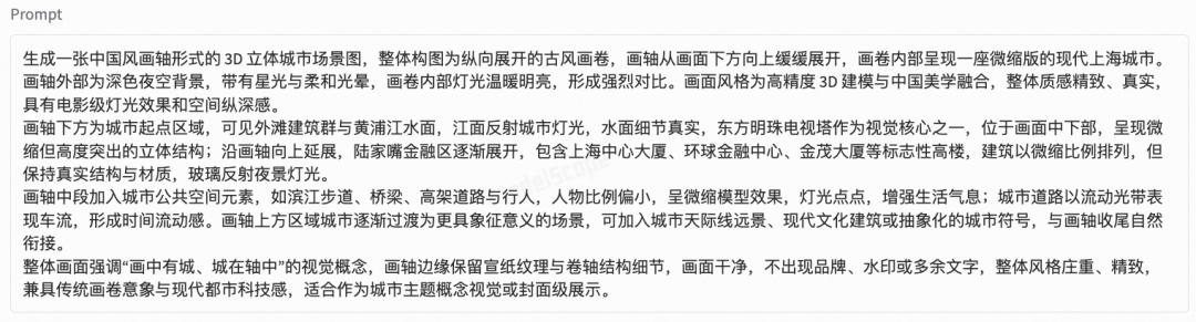 这回咱让AI在「画轴+立体城市+微缩建模+2k分辨率」多重要求同时成立的前提下,生成一幅上海市的3D景观: