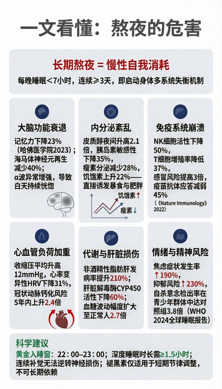 因为我发现,哪怕一张图都不喂,只简单说了一句「生成一个一文看懂的科普信息图表,解释熬夜的危害」,Qwen-Image-2.0给我的,已经是一张数字、汉字、英文全都安排得明明白白的科普海报了: