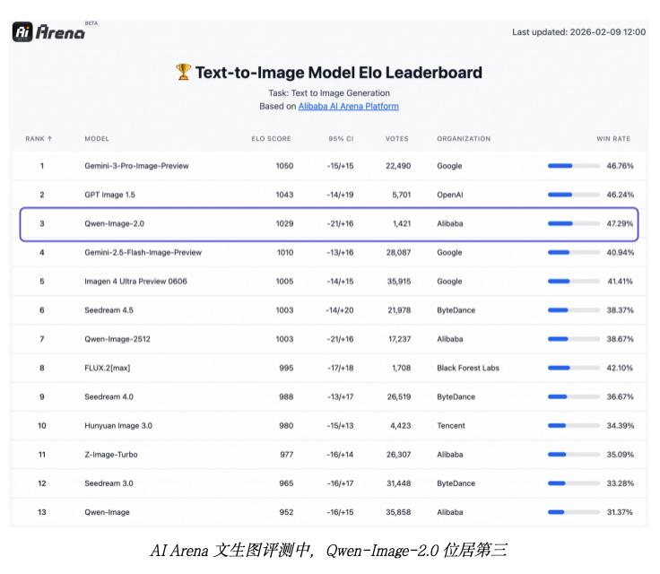 在AI Arena模型评测中, Qwen-Image-2.0在文生图、图生图两个基准测试里也都跑出了相当靠前的成绩,仅次于谷歌Nano Banana Pro和GPT Image 1.5: