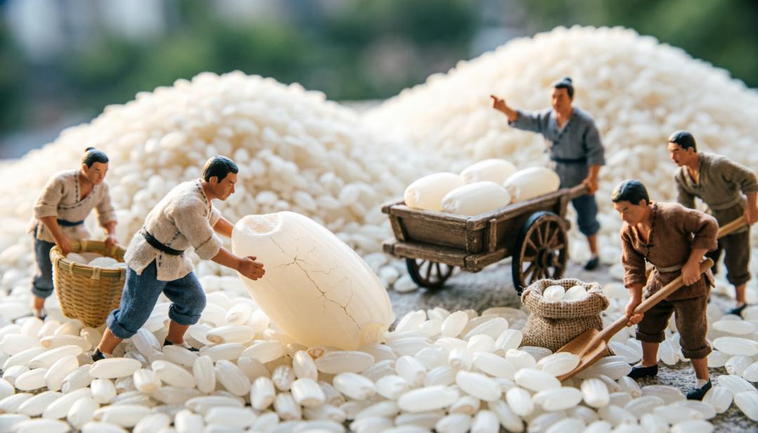 u1s1,整体完成度还是很高的,微缩比例关系准确,大米的尺度夸张但逻辑自洽,而且米粒的半透明质感、裂纹细节和浅景深处理让画面非常接近真实微距摄影了。
