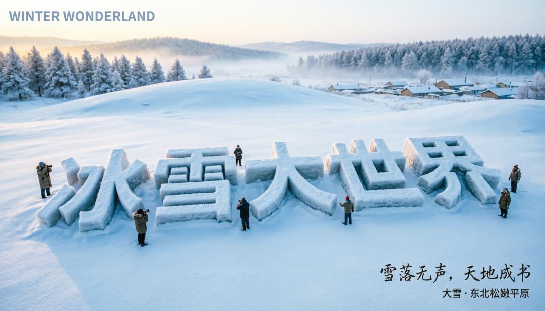 此外,它还能将文字和画作进行完整融合,看下面这个雪雕版的冰雪大世界,远看是字,近看是景,文字和周围的积雪融合得恰到好处!
