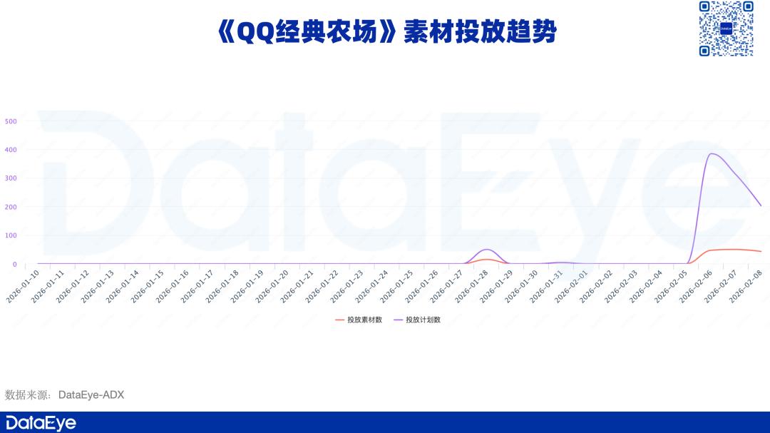 DataEye-ADX投放数据显示, 《QQ经典农场》投放量并不突出,直到上线前夕,投放量才迎来上涨,并在上线当天量级达到最高峰。