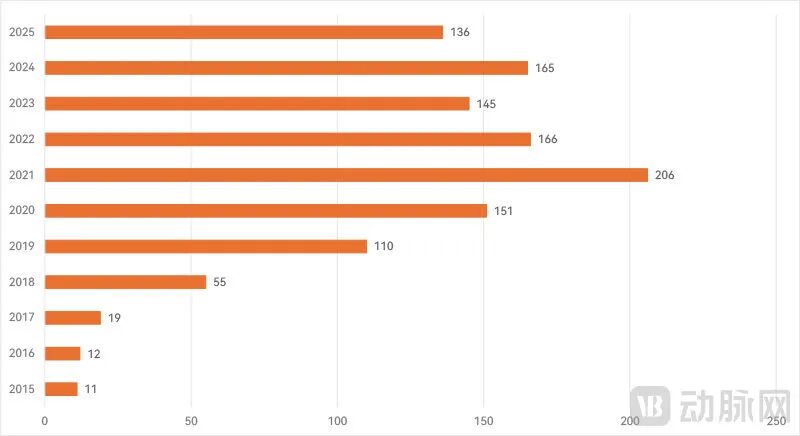 根据FDA官方信息,近年来,每年都有100多款产品被列入突破性医疗器械名单。其中,2021财年(FDA财年为10月至次年9月)更是有超过200款突破性医疗器械,创下纪录。平均来看,近年来突破性创新产品的数量大概维持在每年150~170款之间。根据最新的公告,2025财年前三季度有136款突破性创新产品,全年的数量大致也应该在此区间。