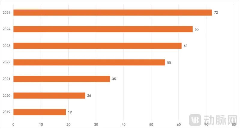 进入创新医疗器械特别审查程序只是开始,后续还需要正式获批才能上市商业化。2025年,国内通过创新医疗器械特别审查程序获批的产品数量达到72款,也创下历年新高。事实上,从2019年开始至今,获批创新医疗器械数量已经连续7年实现增长。