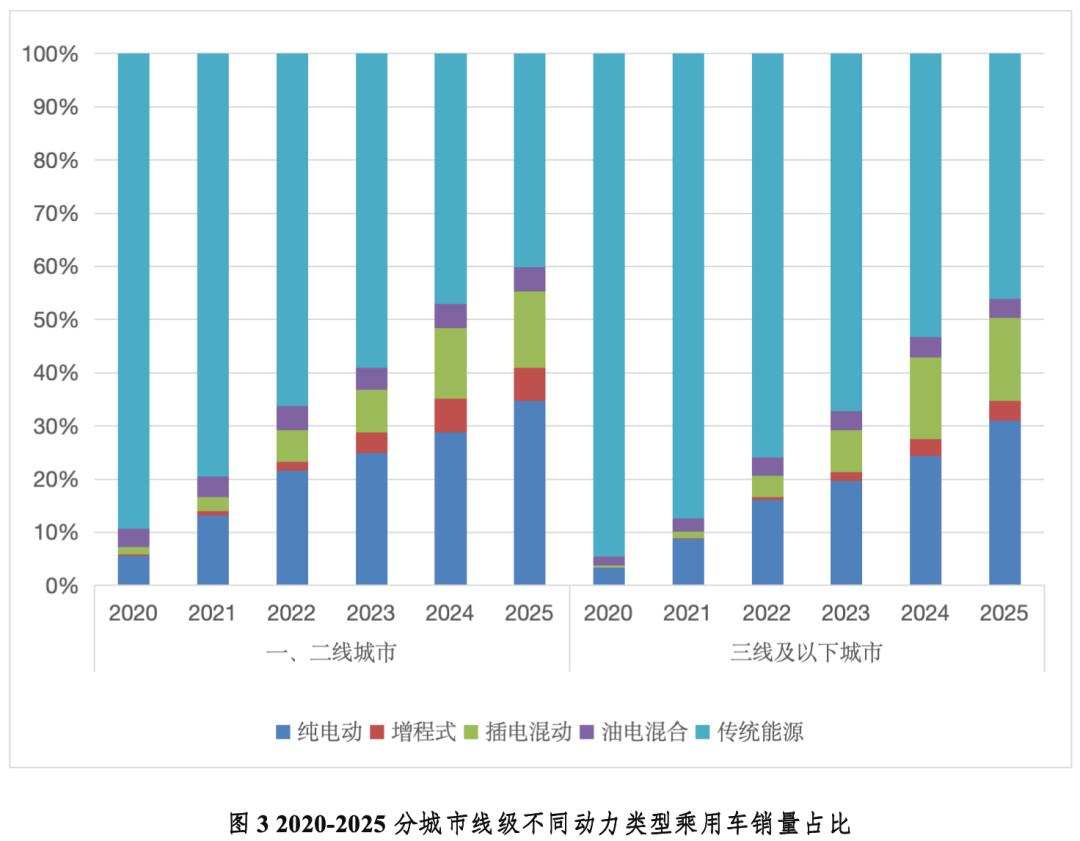 下沉市场正成为驱动国内新能源汽车市场增长的核心引擎。从乘用车消费总量维度看,一线、二线城市市场新增量已趋于饱和,增量空间逐步收窄,三线及以下城市成为拉动销量增长的主力军;从新能源渗透率维度分析,一线、二线城市的新能源汽车渗透率已突破55%,遵循市场发展规律,其增速将逐步回落;而三线及以下城市渗透率在40%以下,仍处于市场普及期,具备强劲的高速增长潜力。