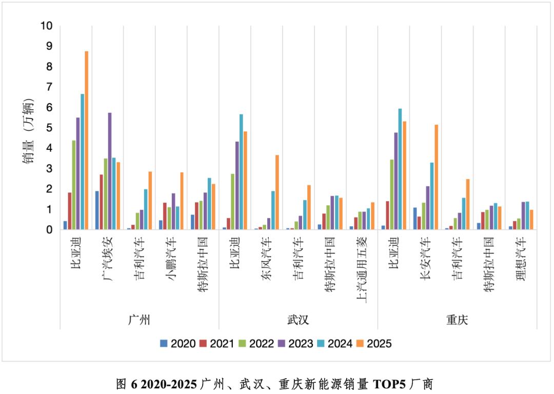 一是产业带动型。该类型城市依托本地及周边龙头车企的产业辐射效应,形成供给充足、口碑扎实、渠道密集的市场优势,以广州、武汉、重庆为代表。2025年广州新能源汽车销量增长的核心动力,来源于比亚迪、小鹏两大本省车企的强力支撑。武汉新能源汽车市场的崛起,主要依托东风汽车的本土化布局与产能释放。重庆新能源汽车销量的稳步攀升,核心驱动力来自长安汽车的产品迭代与渠道深耕。
