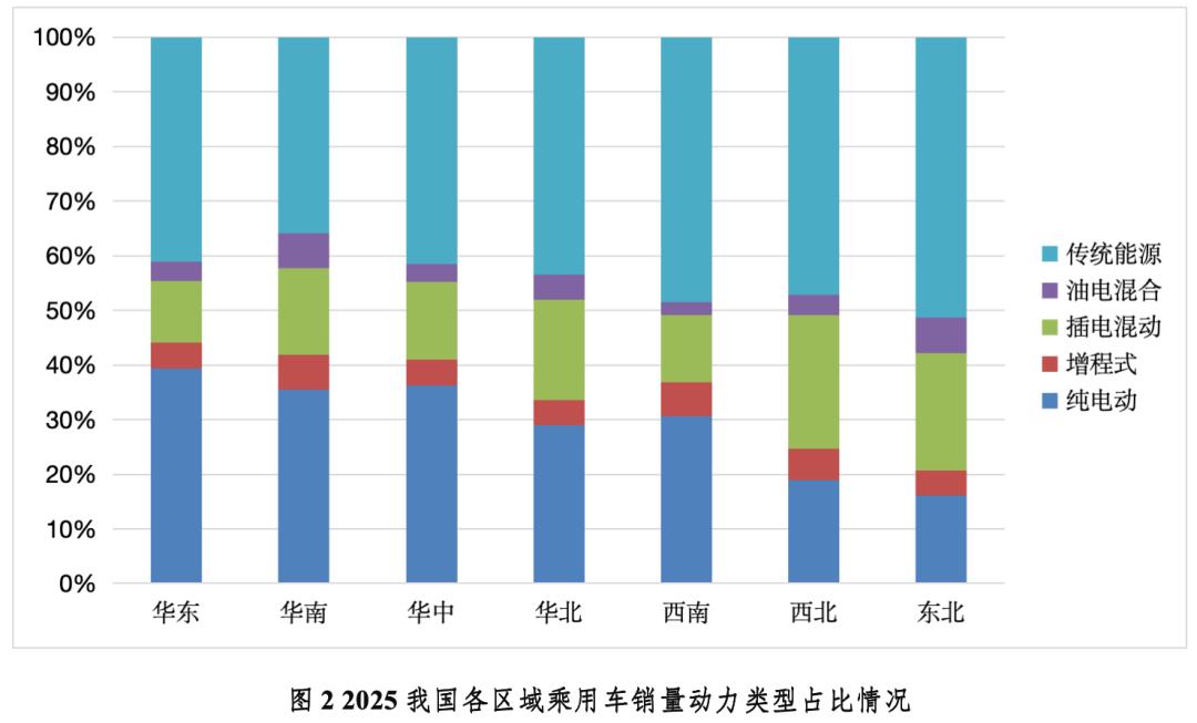 从区域分布特征来看,华东、华南地区的新能源汽车渗透率位居全国前列,占比约达54%;华北与西南川渝地区紧随其后,处于渗透率第二梯队;而西北、东北受冬季寒冷气候的影响,新能源渗透率整体偏低,在新能源车型中,消费者往往青睐续航无焦虑的插电混动车型。