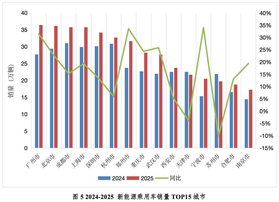 从新能源汽车销量的城市表现来看,2024-2025年销量位居前列的城市包括广州、北京、成都、上海、深圳等,不同城市的增长逻辑差异显著,可归纳为四种发展模式。