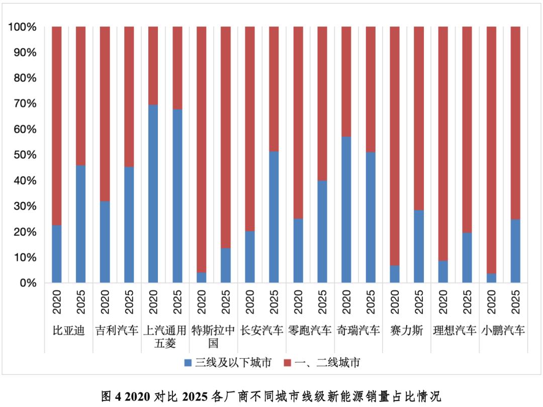 车企正加速布局下沉市场。自主品牌阵营中,五菱将三线及以下城市视为核心阵地,近70%的销量均来源于此;比亚迪、吉利、长安则精准发力,推出海鸥、星愿、Lumin等适配下沉市场需求的车型,实现了销量的快速增长。新势力品牌同样紧跟市场趋势,零跑汽车在三线及以下城市的销量占比达到40%,展现出强劲的市场渗透力;小鹏汽车凭借MONA系列新车型,也实现了下沉市场销量的显著提升。