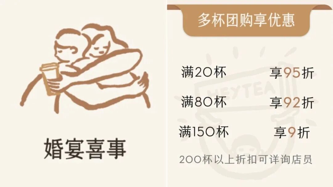 喜茶推出喜宴团餐优惠业务,“满20杯享95折、满80杯享92折、满150杯享9折”,预订后店长还会提供一对一服务,协调口味、配送等细节。