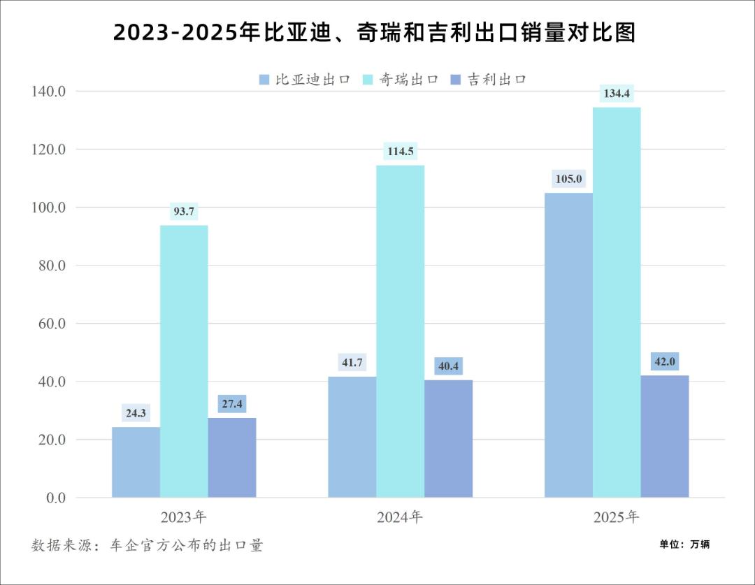 在激烈的市场竞争中,王传福与尹同跃之间的同乡之谊,已被剑拔弩张的竞争取代。数据更能说明这场海外保卫战的残酷。2025年,奇瑞以134.4万辆持续23年蝉联出口冠军,海外销量占比达47.9%。而比亚迪则以104.96万辆紧随其后,同比激增145%,四年复合增长率高达105%,从2021年大举进军海外乘用车市场,到2025年逼近奇瑞,比亚迪只用了四年时间,其凌厉攻势可见一斑。