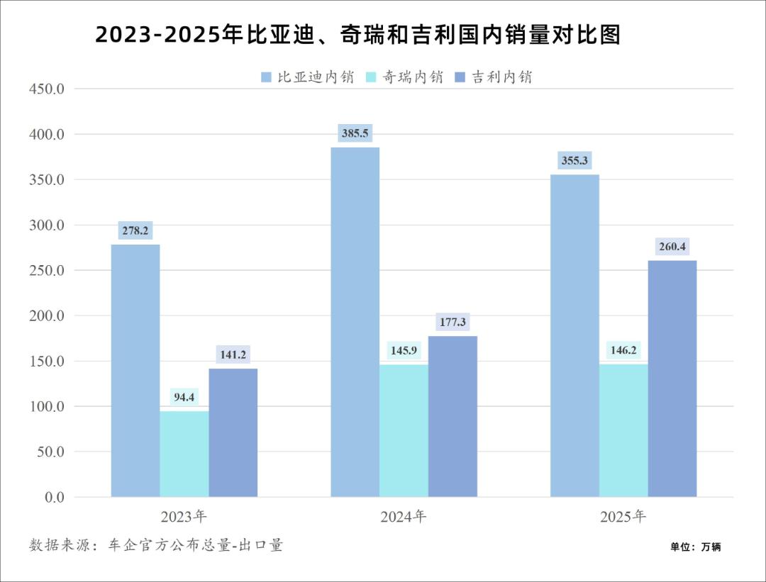 这个使命,落在去年5月份从安聪慧手里接过接力棒的淦家阅手里。半年之后,数据见证了新团队的爆发力和穿透力:2025年,吉利汽车全年销量达302万辆,同比大幅增长39%,在比亚迪零售销量同比下滑6.3%的背景下,吉利拉近了两者距离——国内销量从2024年近200万辆的差距(386万辆VS190万辆),大幅缩小至2025年的95万辆(355万辆VS260万辆),吉利的反攻劲力十足。