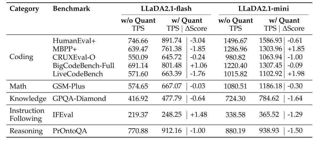 技术报告显示,在HumanEval+编程基准上,LLaDA2.1-flash(100B)在Speedy Mode下达到892 TPS的峰值速度,而Quality Mode则在多项推理任务上超越了前代模型。