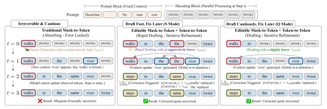 - 阶段二(T2T, Token-to-Token):立即启动编辑模式。模型站在全局视角,对刚才生成的草稿进行检查。如果发现某些token置信度低或者逻辑不通,就直接进行回溯式修正。