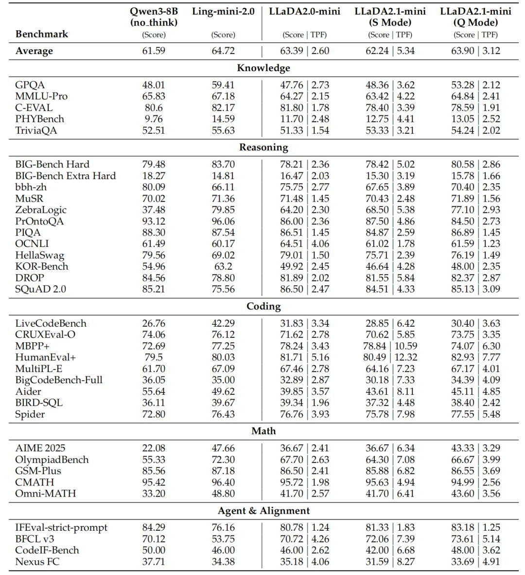 结果显而易见:LLaDA2.1在IFEval(指令遵循评估)、BFCL(函数调用)等对齐类任务上显著提升,证明扩散模型不仅能快,更能懂你。