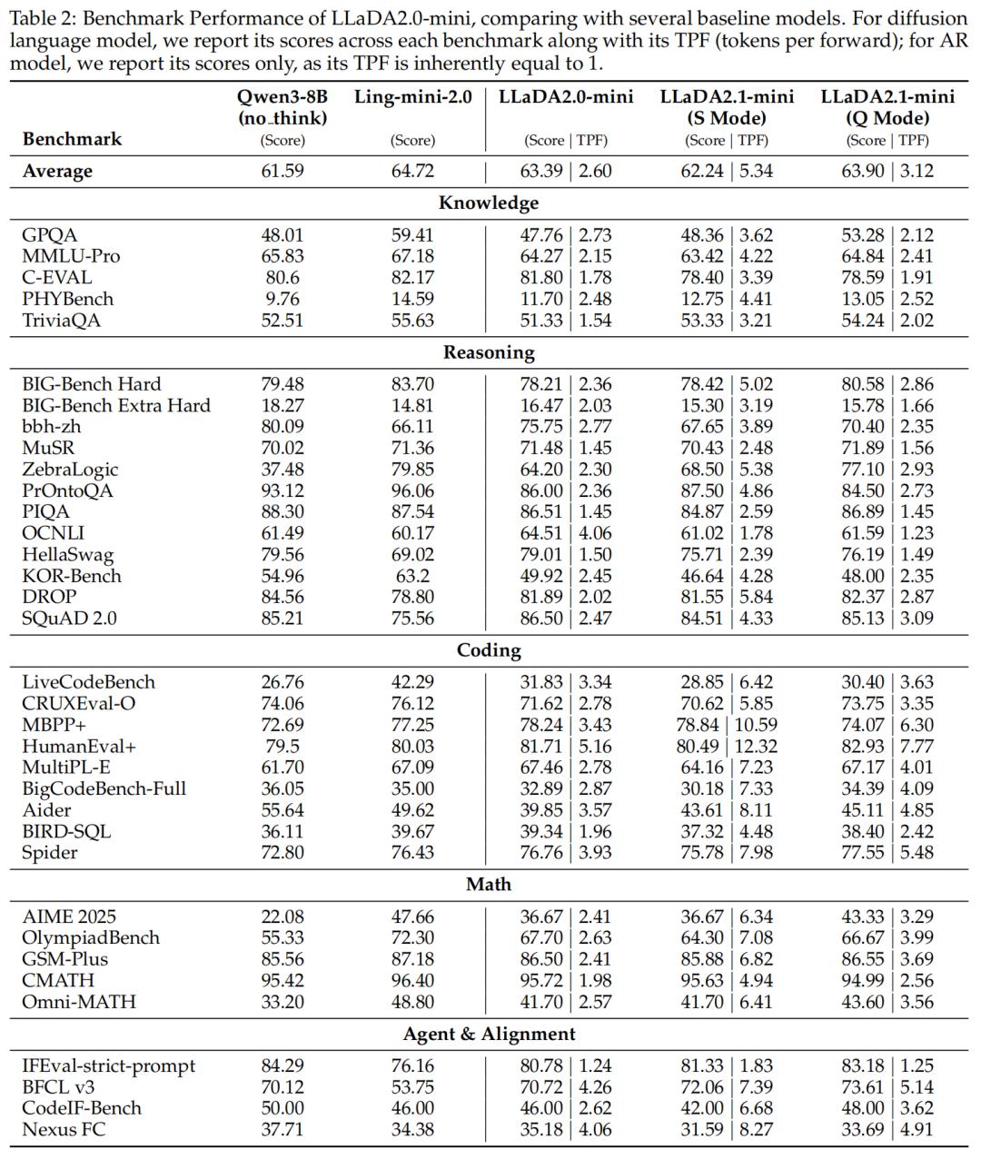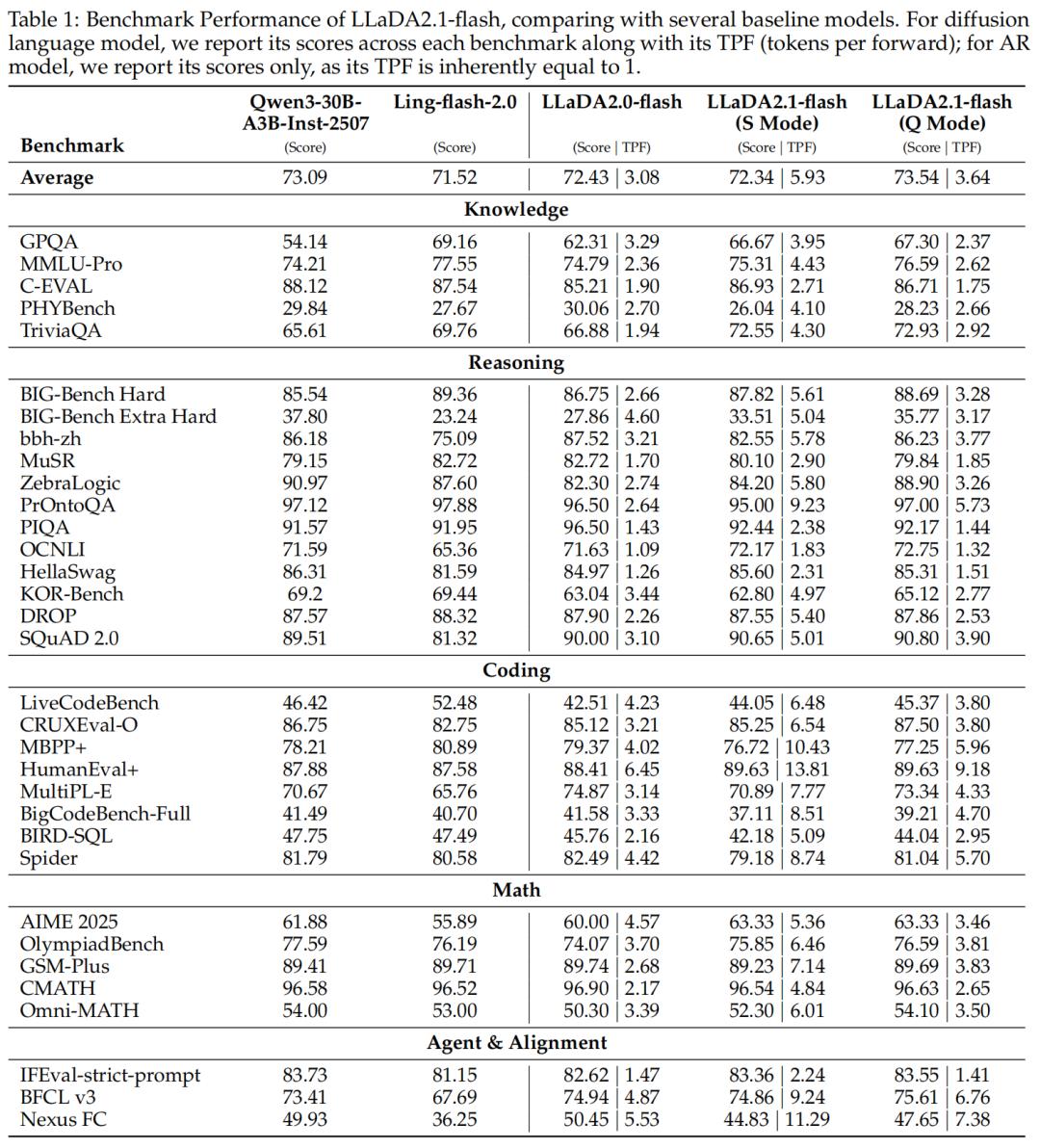 表 1 和表 2 报告了 LLaDA2.1-flash 与 LLaDA2.1-mini 相对于其他模型的对比结果,包括性能得分以及 TPF(每次前向推理生成的 token 数)。实验结果显示,在 S 模式 下,LLaDA2.1 的任务得分相较于 LLaDA2.0 略有下降,但 TPF 获得了显著提升;而在 Q 模式 下,LLaDA2.1 在 mini 与 flash 两个规模上均全面超越了 LLaDA2.0 的表现。