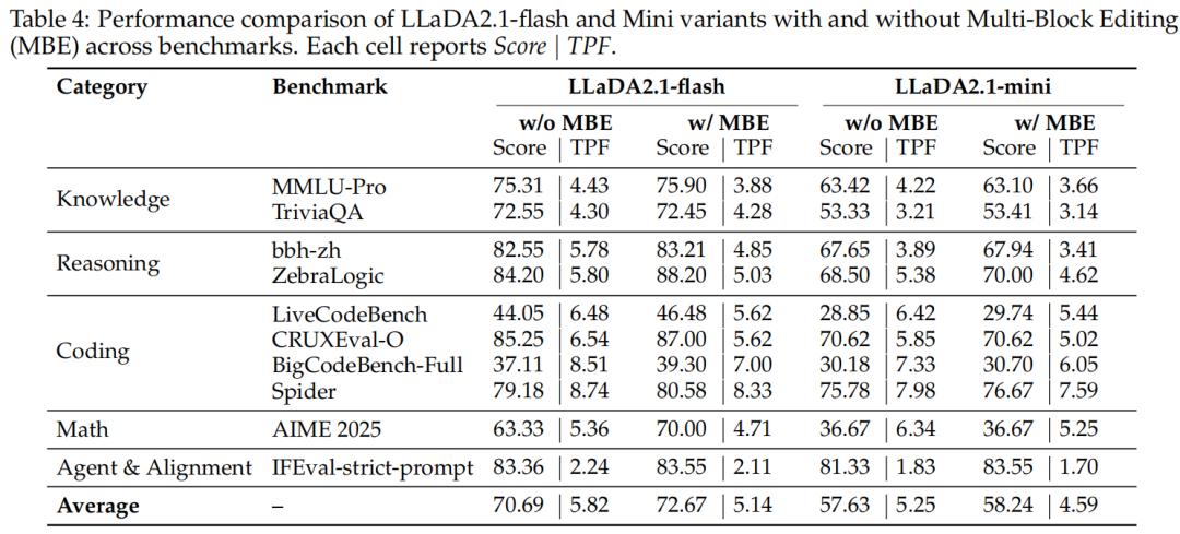 如表 4 所示,在相同的 S 模式设置下,引入多块编辑(Multi-Block Editing,MBE) 能够在 Flash 与 Mini 两个模型版本上,跨多个基准稳定提升性能,代价仅为吞吐率的小幅下降。
