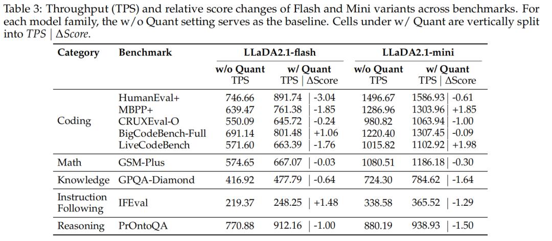 表 3 进一步聚焦于 LLaDA2.1 在 S 模式下的速度性能。可以观察到,该模型在不同任务领域之间呈现出明显的速度差异,其中代码类任务的吞吐率最高,而指令遵循类任务相对较低。具体而言,在量化之后,LLaDA2.1-flash 在 HumanEval+ 基准上达到了891.74 TPS 的峰值速度,而 LLaDA2.1-mini 的峰值TPS 则高达 1586.93,展现出显著的推理效率优势。