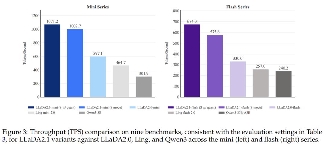 图 3 进一步展示了在表 3 所涵盖的五类任务领域中,LLaDA2.1 与 LLaDA2.0、Ling 以及 Qwen-3 等模型在吞吐率(tokens per second)上的对比结果。整体来看,LLaDA2.1 在 S 模式下展现出极为突出的速度优势:在仅牺牲极少输出质量的前提下,实现了显著更快的推理速度。