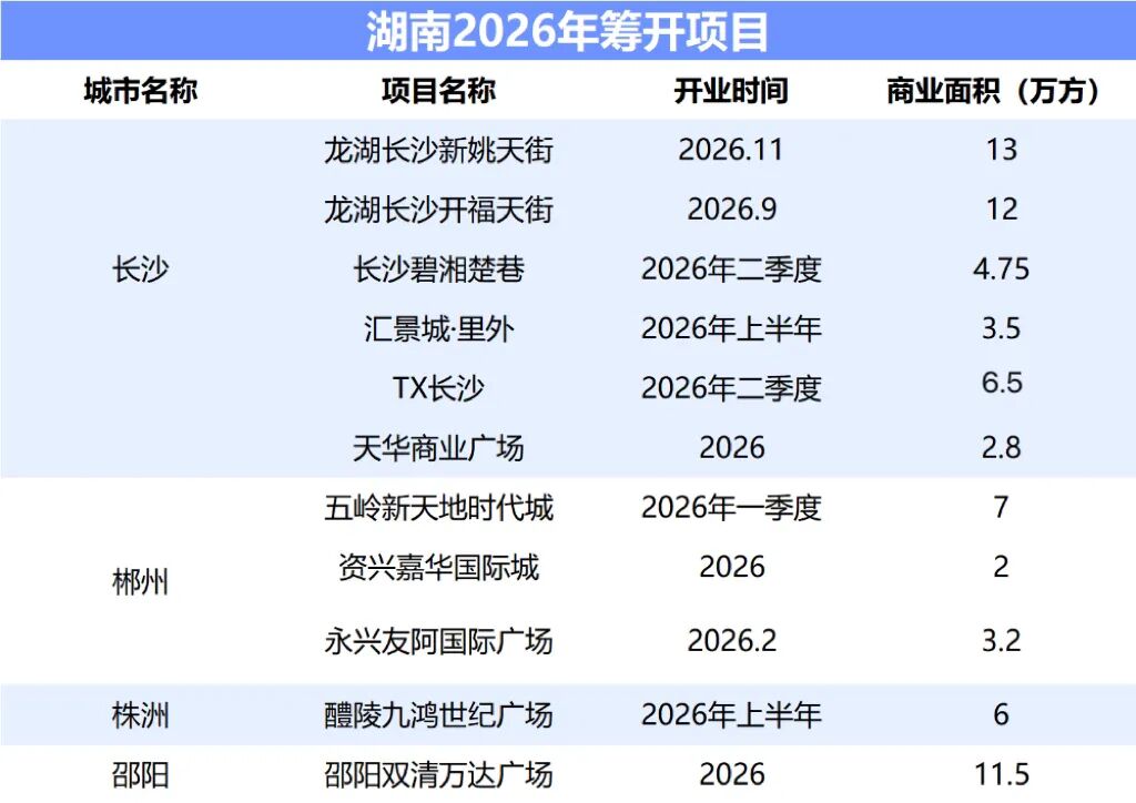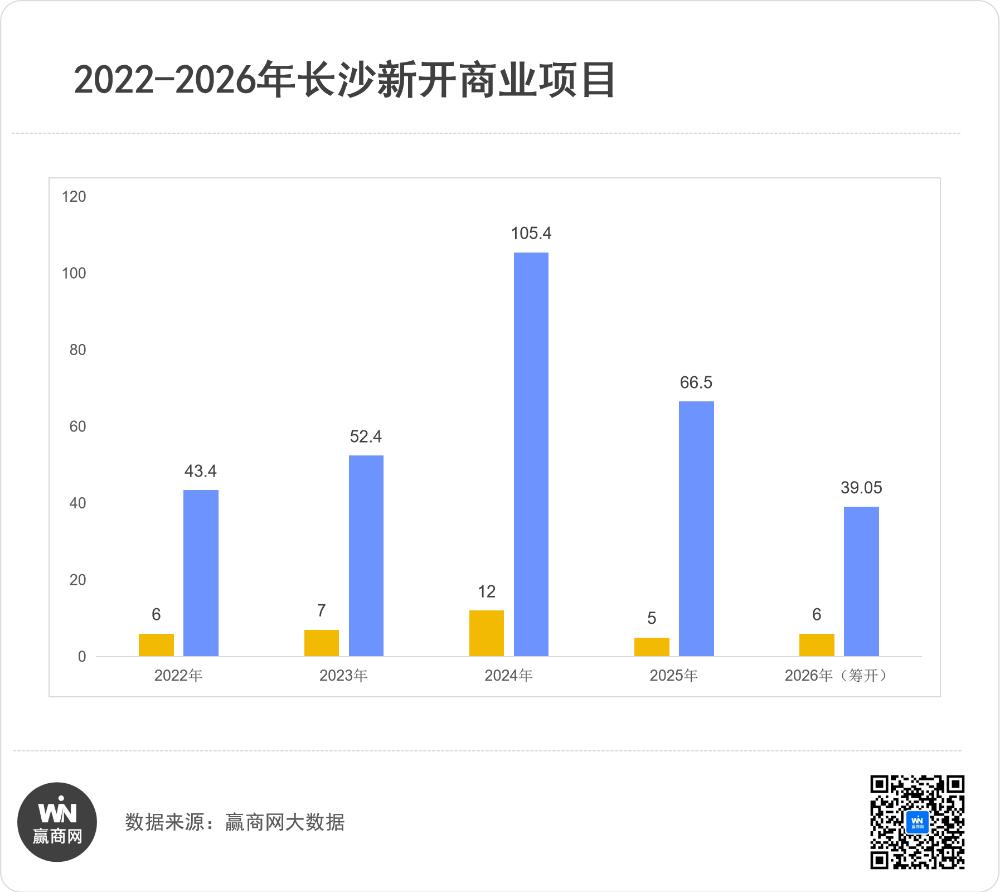 作为湖南商业发展的标杆城市,长沙这一趋势尤为明显:2024年长沙新增商业项目12个,体量达105万方,规模之最;而2026年长沙筹备开业的商业项目仅6个,体量约42.5万方,商业供应创下近五年来的新低。