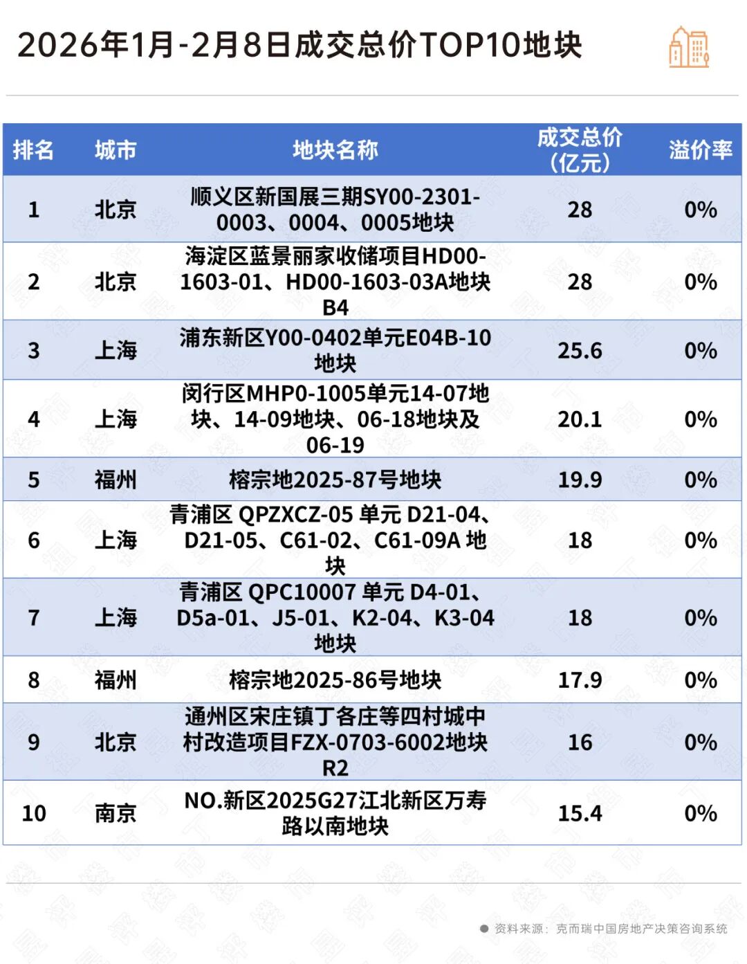 除北京、上海以外,1月全国300城土地成交金额TOP10地块,均为“零溢价”。