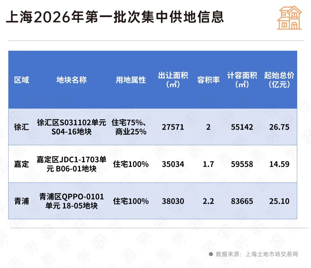 就在1月底,上海已预告2026年首批三宗涉宅用地,地块位于徐汇、嘉定、青浦,总出让面积10.06公顷,起始总价66.44亿元,既有中环内地块,又有低密宅地出让。徐汇长桥板块地块出让底价最高,达到26.75亿元,周边城市界面成熟,各项配套完善,周边新房价格约为11万元/平方米。位于嘉定新城核心区域的嘉定区地块容积率最低,仅1.7,限高40米,准匹配当下改善需求。整体延续“以需定供、精准供地”的供地思路。