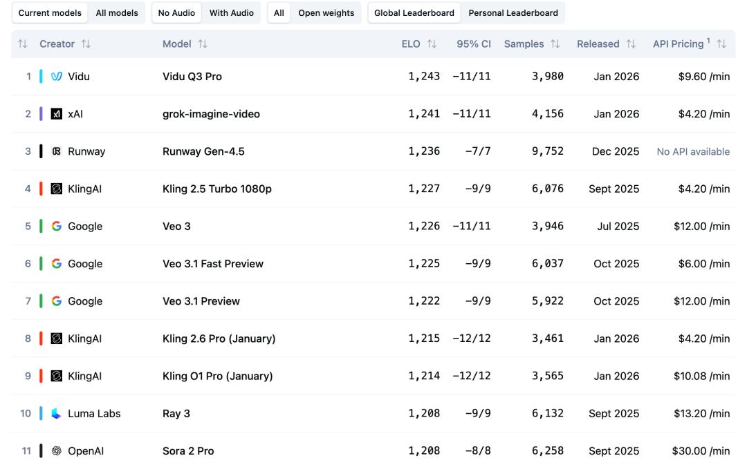 ▲AI文生视频模型性能排行榜最新榜单截图