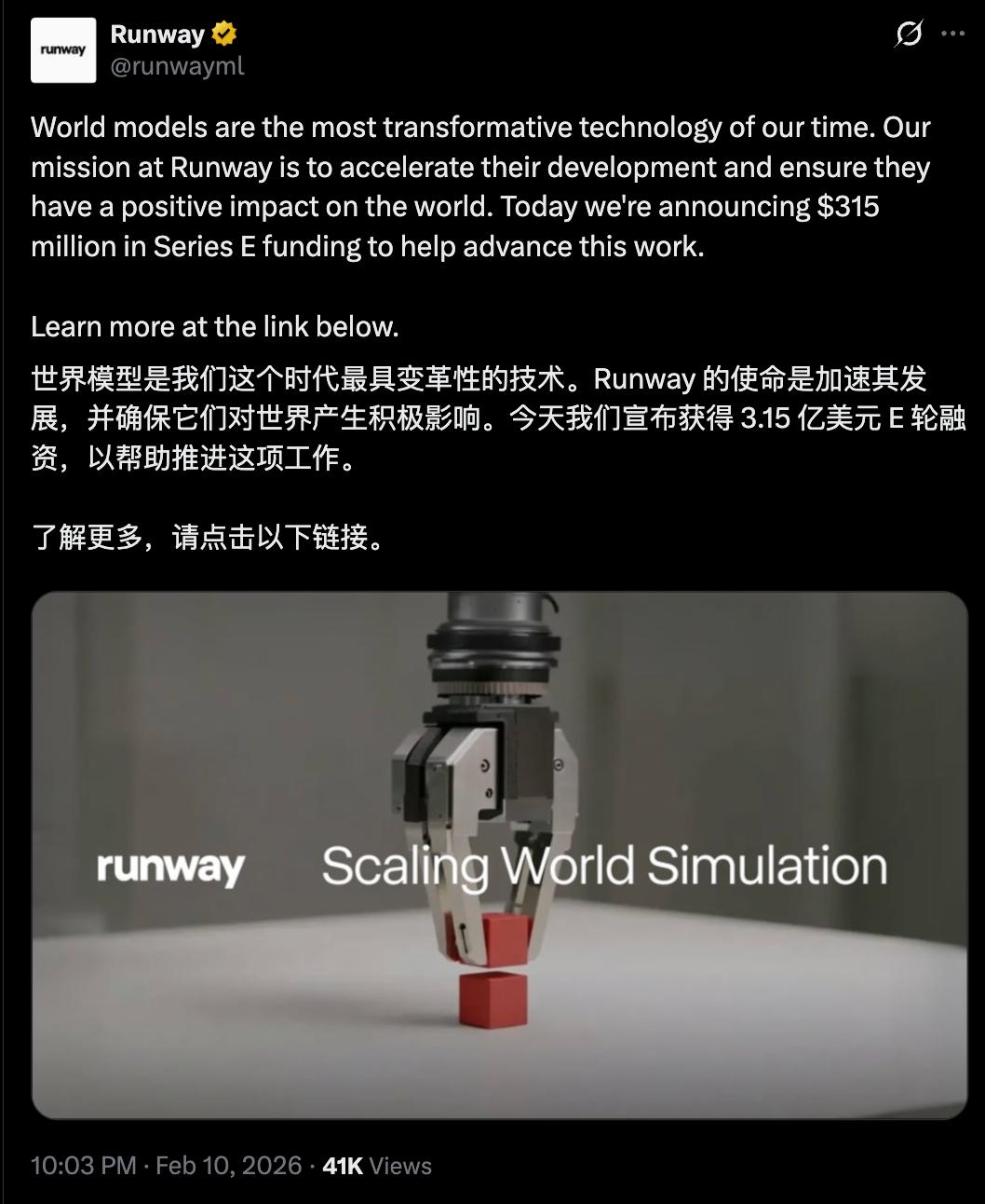 其官宣公告提到,新融资将被用于训练下一代世界模型,然后将世界模型带到新的产品和行业中。在去年12月Gen-4.5发布后10天,Runway还推出了通用世界模型GWM-1,旨在实现实时模拟现实,并做到交互式、可控、通用。