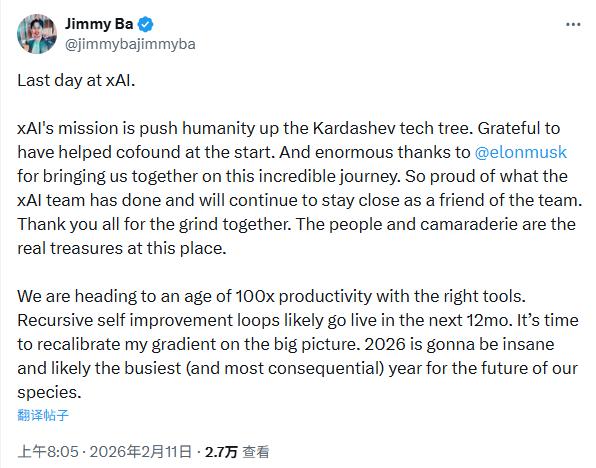 2月11日,xAI 联合创始人吉米 · 巴(Jimmy Ba)表示,他已于当地时间周二离开马斯克的这家初创公司。