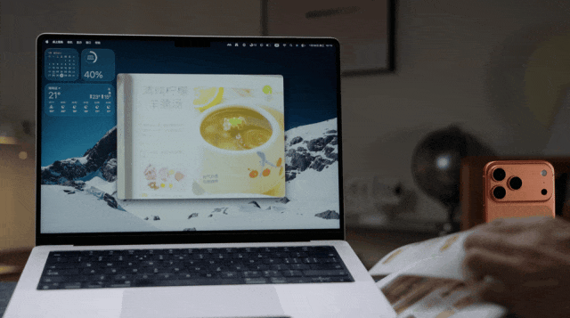 更有意思的是「连续互通相机」。打视频会议时,MacBook 的摄像头不够清晰,系统会自动调用旁边 iPhone 的后置镜头。甚至还能利用超广角算法,在不用任何支架的情况下,拍出你桌面的俯视图。