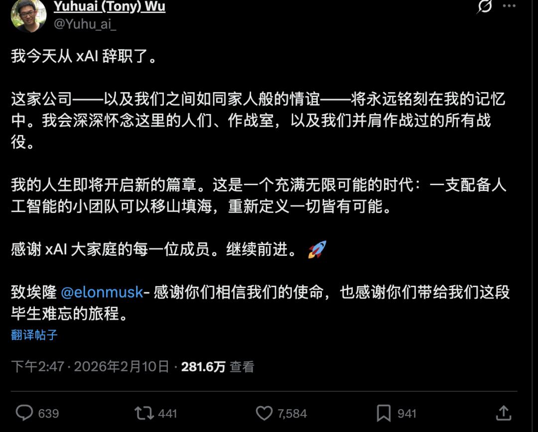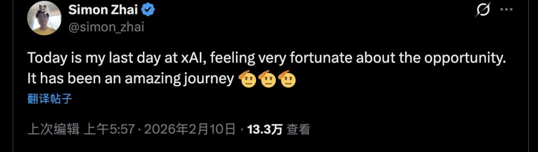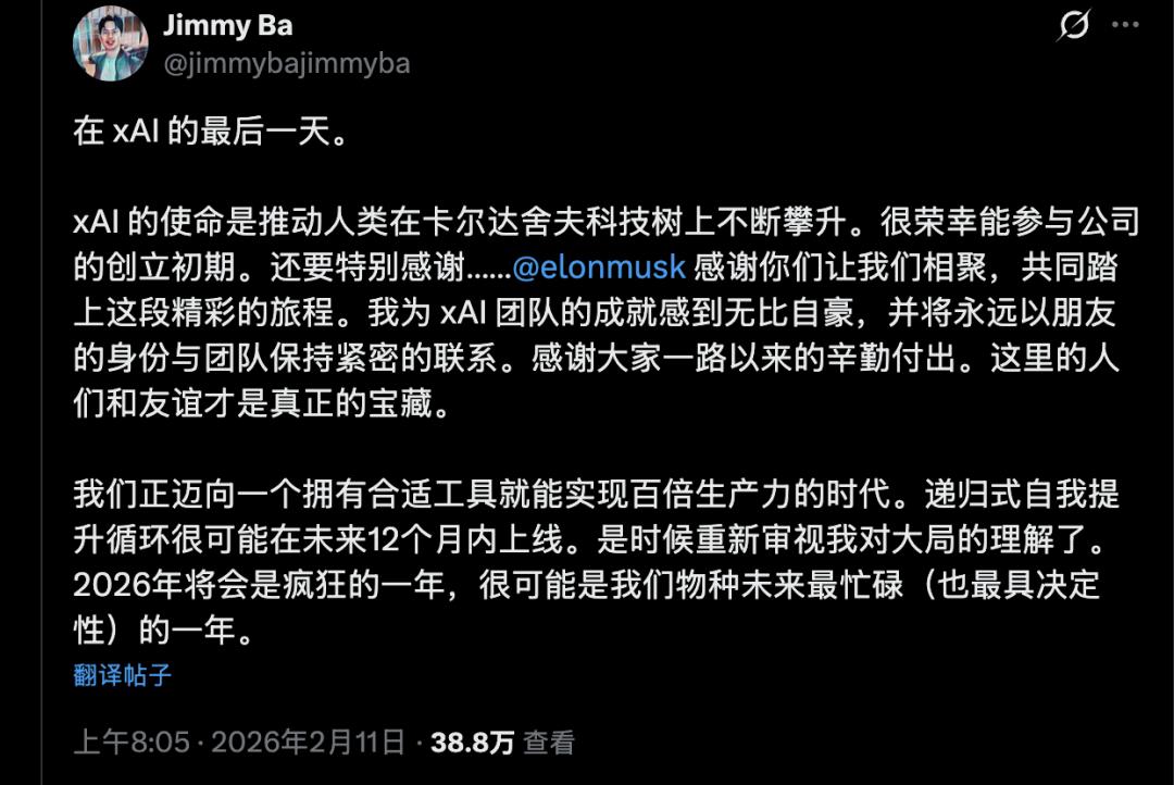 他在离职声明中感谢了马斯克,并称2026年将是”人类未来发展史上最繁忙(也最具决定性意义)的一年”。