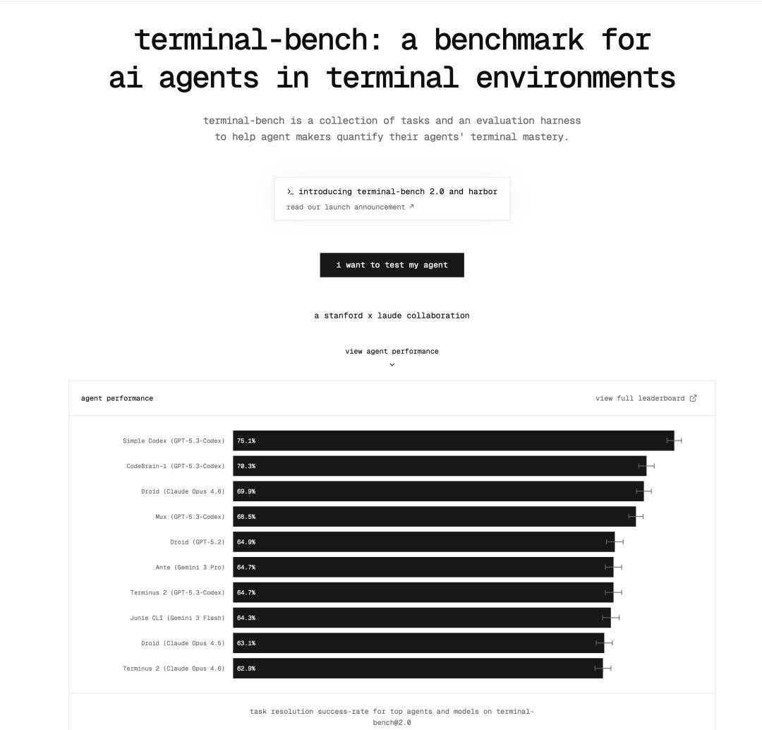 Terminal-Bench 是由斯坦福大学与 Laude Institute 联合打造的开源基准,被公认为 AI 智能体在真实命令行(CLI)环境下端到端执行能力的「金标准」。