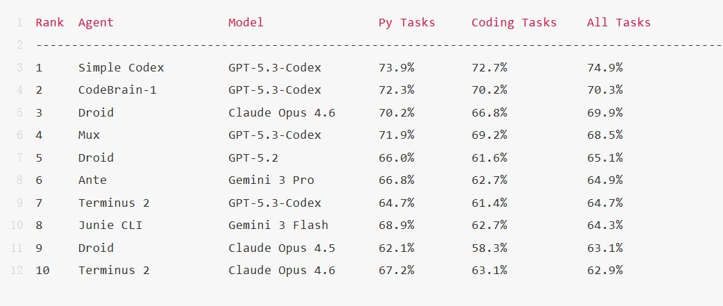 令人振奋的是,在这一权威赛道上,中国的AI初创团队Feeling AI异军突起——其自研的CodeBrain-1在GPT-5.3-Codex底座模型的加持下,以 72.9%(70.3%)的惊艳战绩跃升全球榜单第二,成为前十强中唯一的中国新锐。