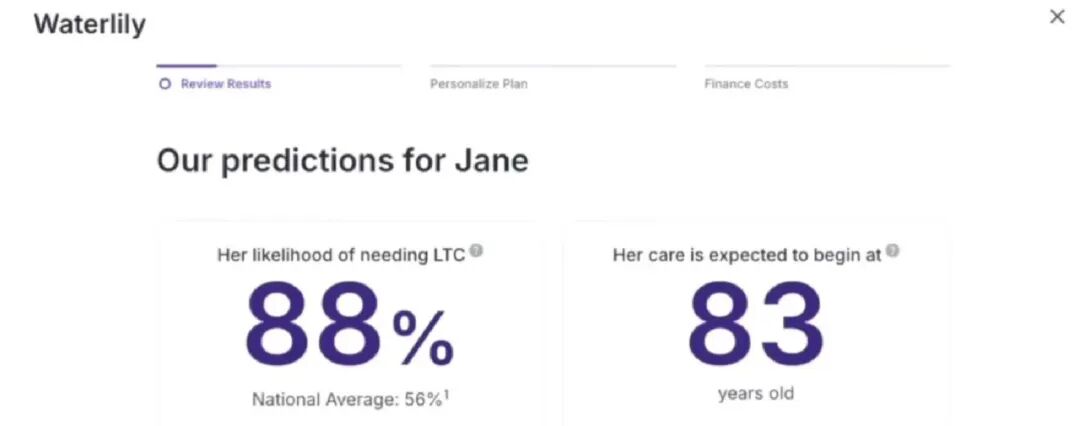 Waterlily 利用 AI 技术,训练了超过5亿个数据记录(包括临床健康数据、人口统计学数据、理赔数据等)。用户只需输入简单的个人信息(年龄、性别、家族病史、生活习惯等),AI 就能推算出其进入失能状态的概率、可能的起止年龄、病程发展轨迹。