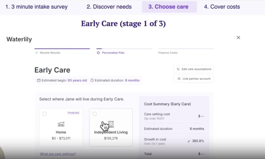 医生只管看病,理财师只管算钱,而 Waterlily 不仅能预测你会得什么病,更重要的是预测这种病在你的居住地需要花多少护理费。