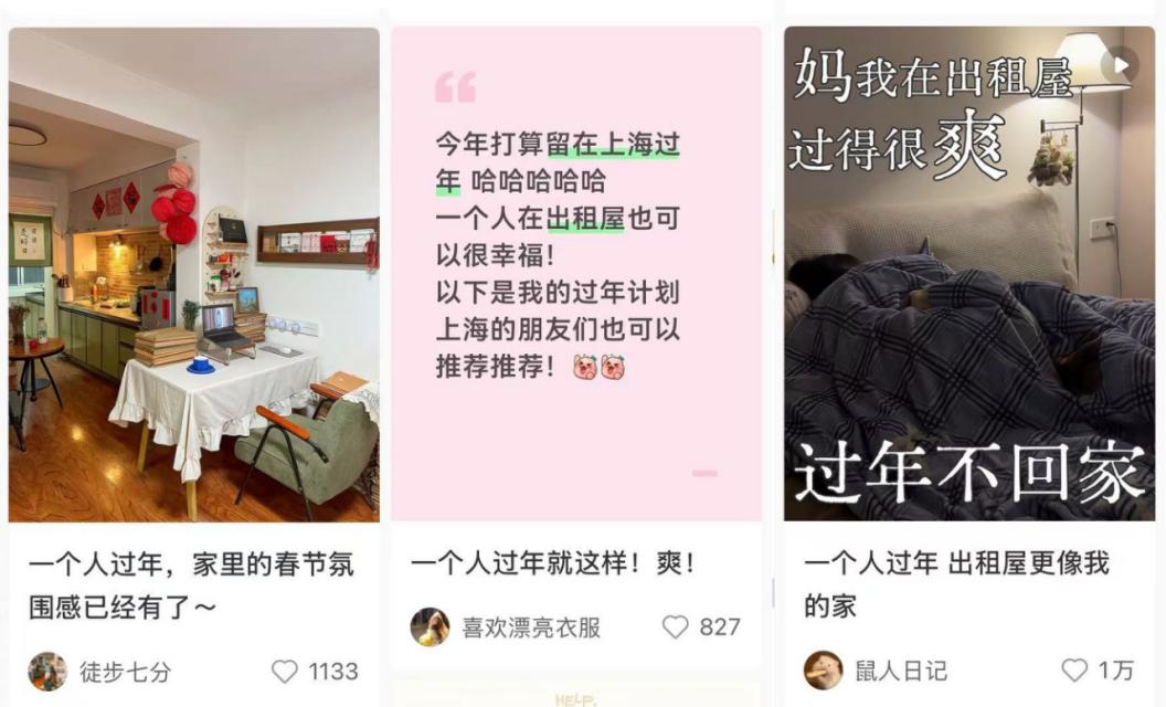 但现在“一个人过年”的互联网叙事逐渐变了。一些年轻人会主动选择“一个人过年”,并且对这件事很期待、很兴奋。在小红书#一个人过年 话题 之下,就有很多这样的笔记:《把出租屋打扮成什么样比较有年味儿?》《买点什么一个人过年比较爽?》《一个人过年,想想就很爽》……