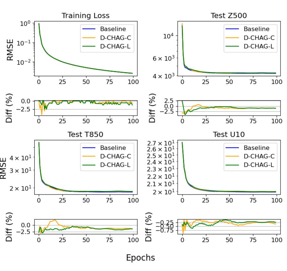 研究人员在 ERA5 数据集上进行 30 天气象预测实验,下图比较了基线方法与 D-CHAG 方法在天气预测应用中的训练损失及三个测试变量的 RMSE: