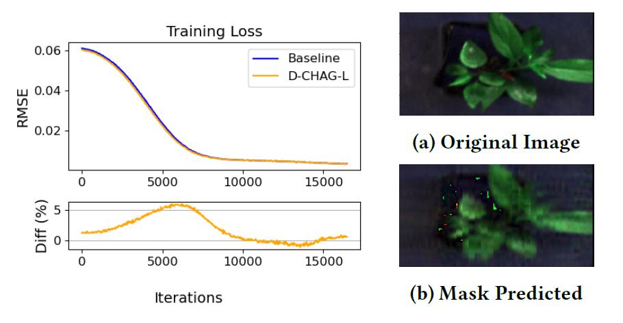 下图比较了基线方法与 D-CHAG 方法在高光谱植物图像掩码自编码器应用中的训练损失,结果显示:在训练过程中,单 GPU 实现与 D-CHAG 方法(在两块 GPU 上运行)的训练损失表现高度一致。
