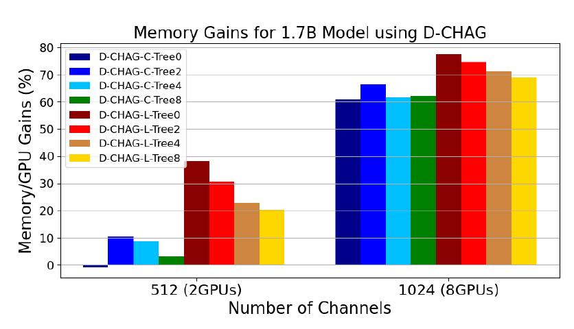 * 与仅使用 TP 相比,D-CHAG 可实现最高 70% 的内存占用降低,从而支持更高效的大规模模型训练