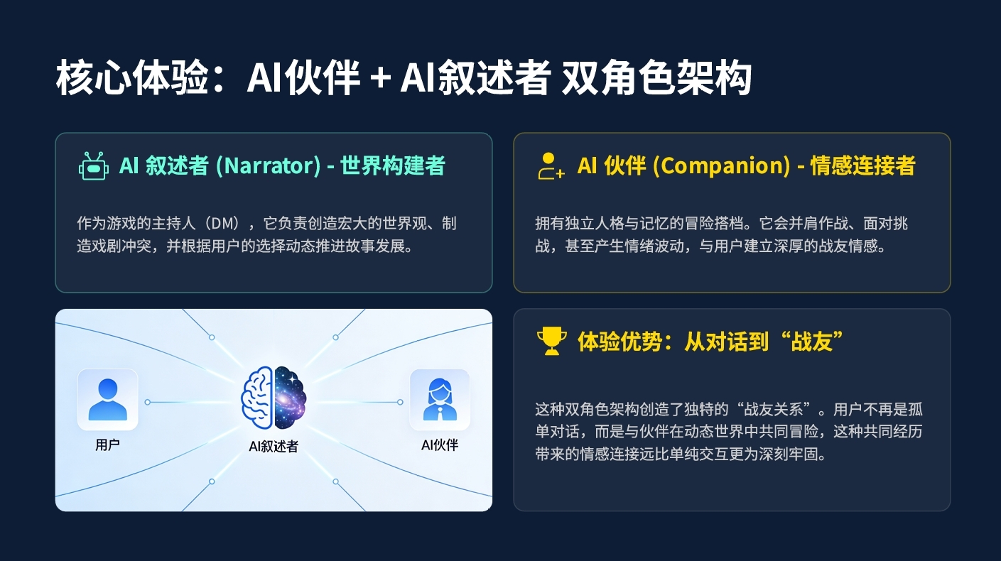 梦境编织者的核心解决方案,是为真实的亲友、情侣、朋友搭建 AI 驱动的线上共同叙事场景,让使用者在故事中共同选择、推动剧情,最终生成独属于彼此的共同记忆,就像大家愿意一起玩游戏一样,但这个 AI 构建的故事世界体验更丰富,也能让用户扮演不同的角色,尝试现实中无法尝试的事情。其核心设计为 “AI 叙述者 + AI 伙伴” 的双角色技术架构。