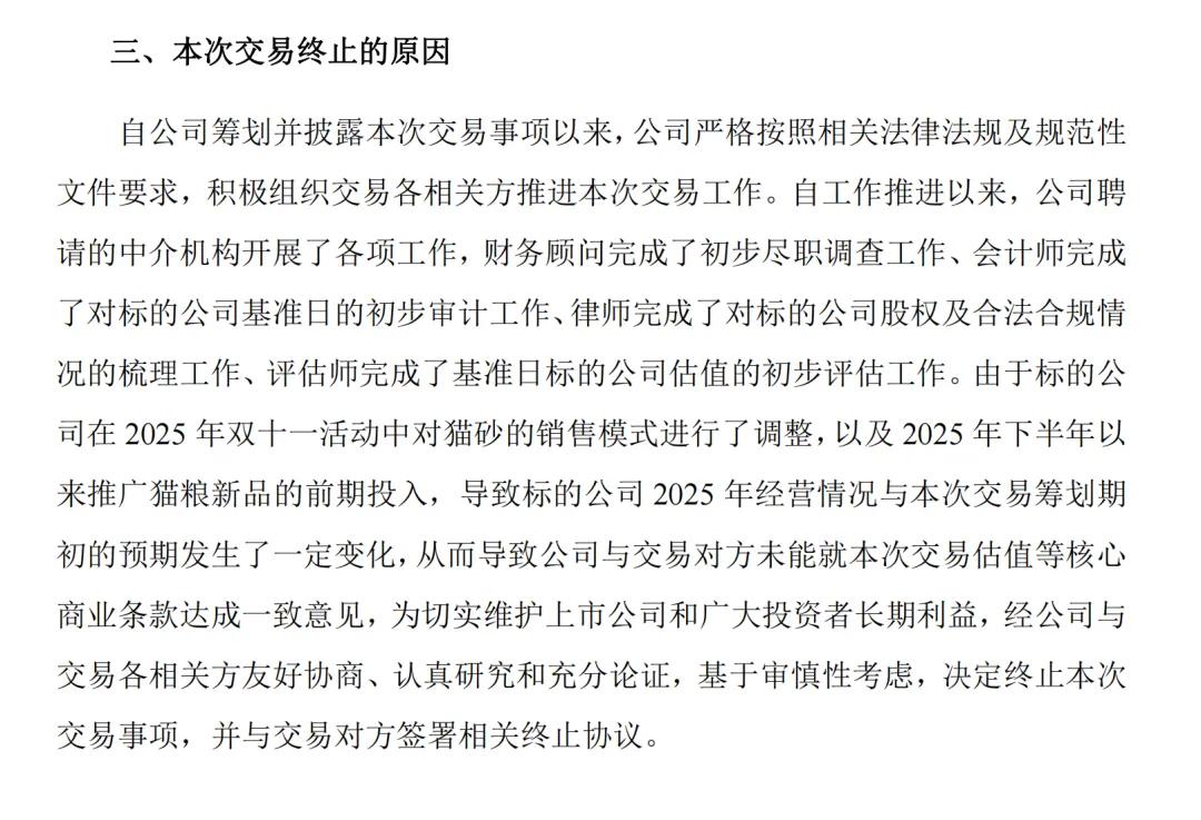 从公告披露的原因来看,交易终止主要指向两点变化:其一,高爷家在2025年双十一期间,对猫砂业务的销售模式进行了调整;其二,自2025年下半年起,加大了猫粮新品的前期推广与投入,导致标的公司2025年的经营情况,与本次交易筹划期初的预期出现一定差异。最终,双方未能就估值等核心商业条款达成一致意见。