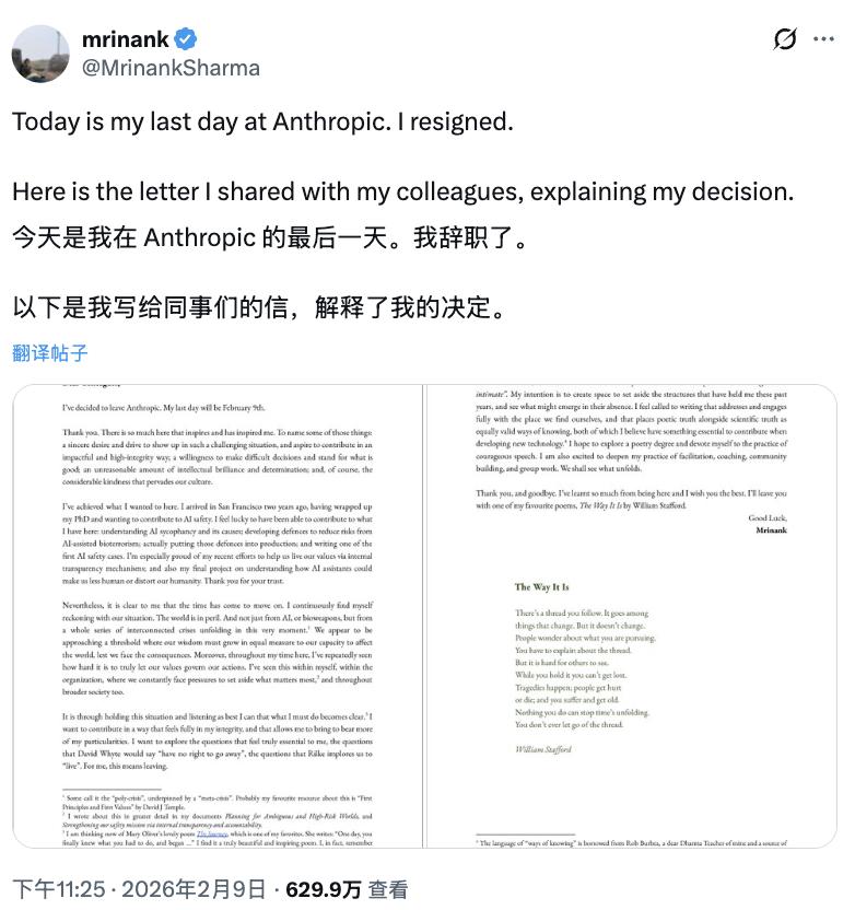 Anthropic,这家以“安全 AI”为核心定位的明星公司,其高级人工智能安全负责人 Mrinank Sharma 在 X 上宣布自己已于 2 月 9 日正式离职。