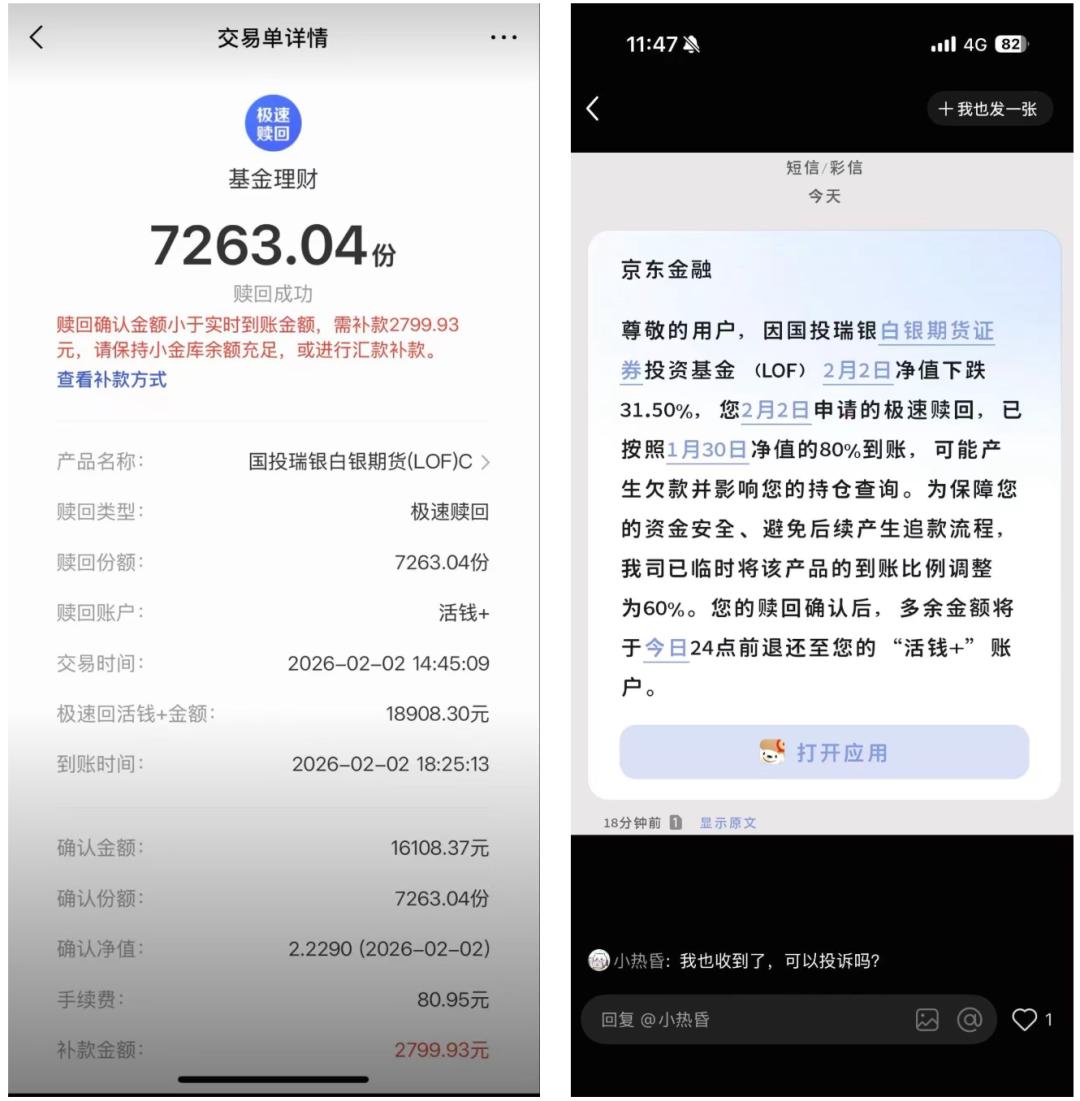 由于京东事先为部分“极速赎回”的客户按 1 月 30 日晚的净值垫付了 80% 的赎回金额,白银LOF的夜间巨震使得京东制造了 2026 年中国基金圈非常魔幻的一幕:基民卖掉基金的钱还没捂热,就收到了一条“补款提醒”: